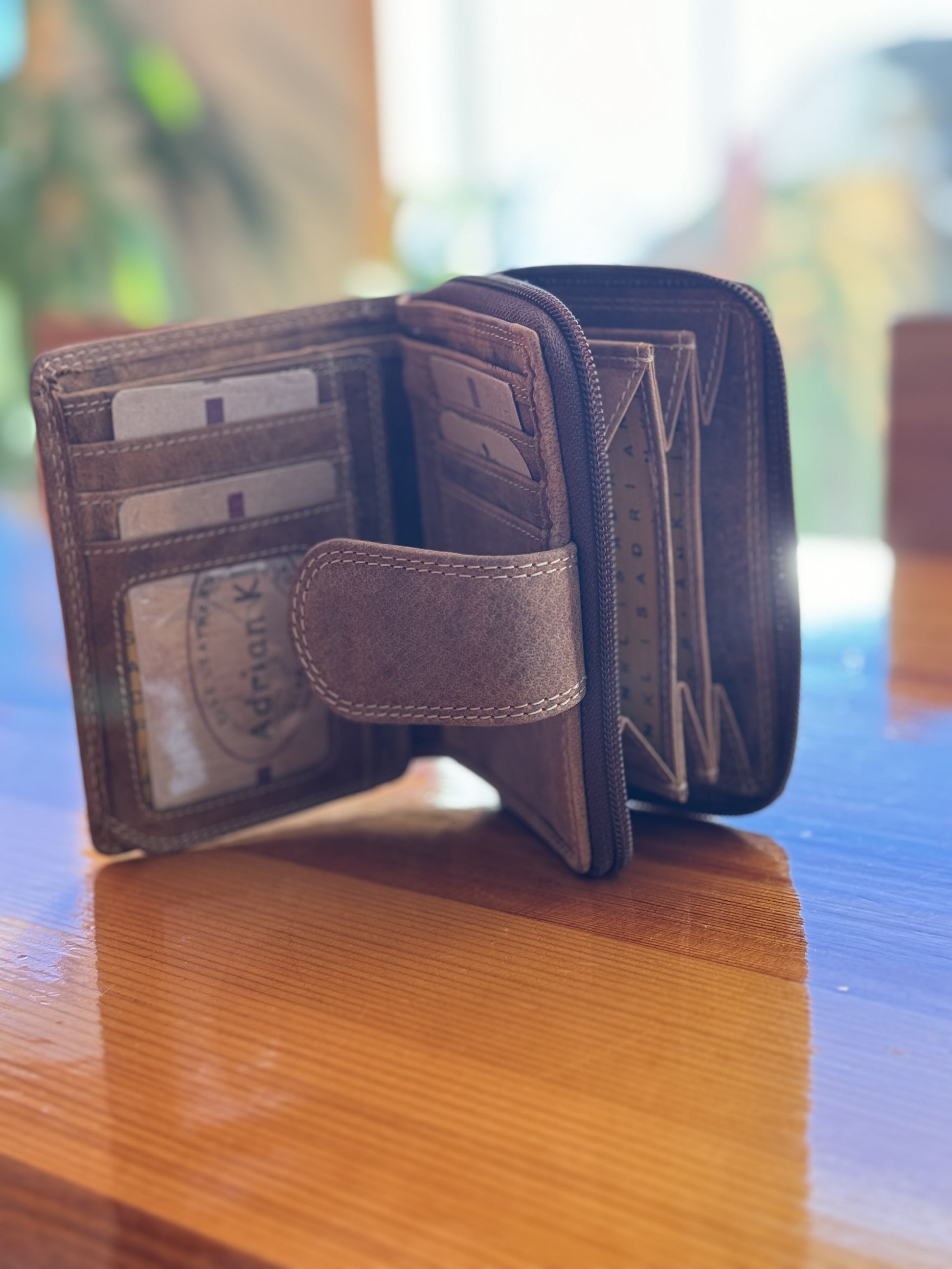 Introducing the Adrian Klis Wallet, a testament to exquisite craftsmanship in buffalo leather. Secure your essentials with the front button enclosure, and open to discover four panels of dedicated card storage, ensuring seamless organization. This trifold design goes beyond the ordinary, featuring a designated cash storage section and a backside accordion zippered enclosure for added convenience. Elevate your everyday carry with Adrian Klis, where buffalo leather meets innovative design, providing a wallet that harmoniously blends style, functionality, and security.