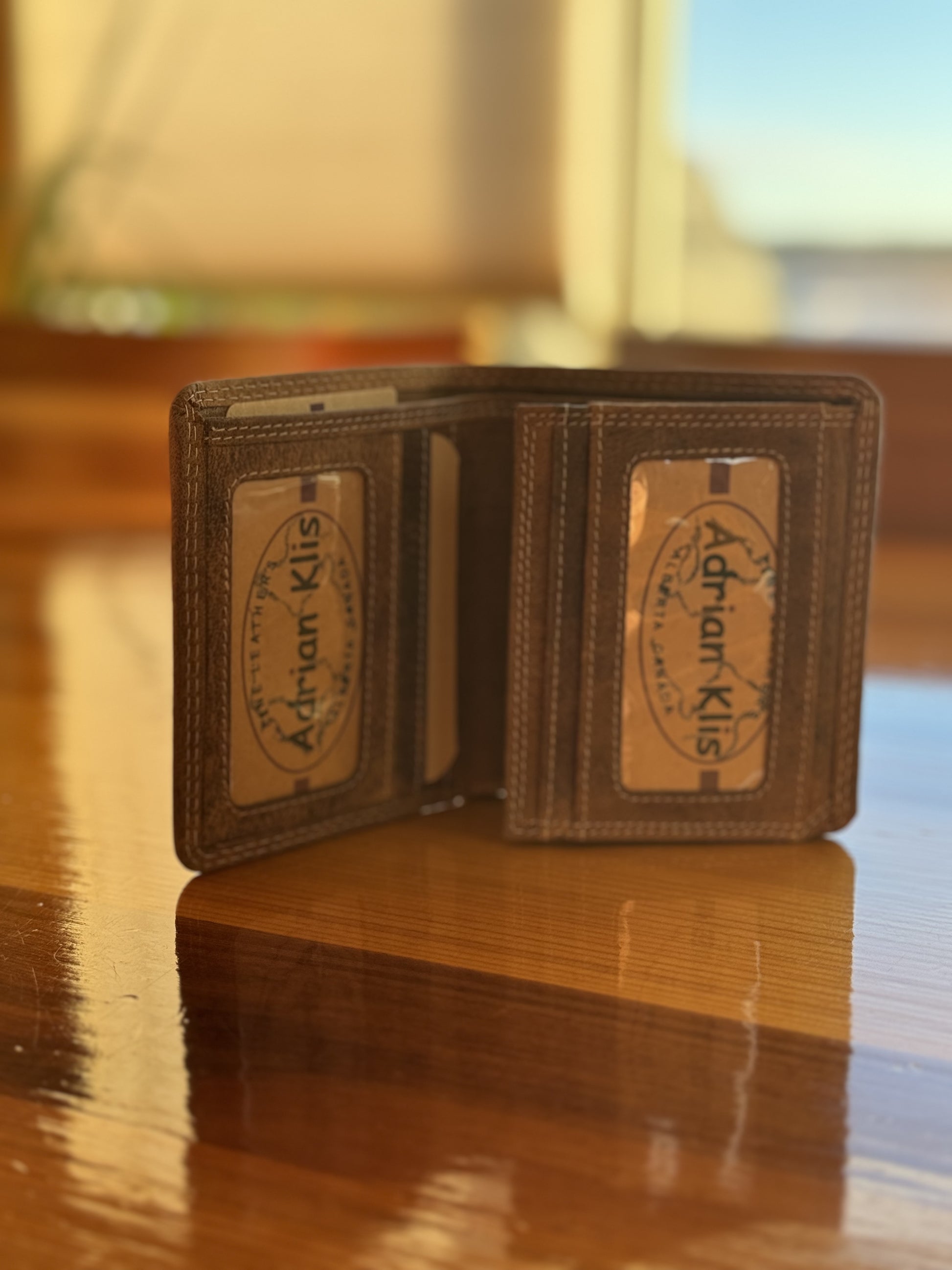 Explore the epitome of craftsmanship with Adrian Klis's trifold wallet. Immerse yourself in functionality with dual ID slots and seven card slots, all meticulously designed for practicality. Crafted from 100% genuine bison leather in the heart of Alberta, each wallet boasts durability and a handmade touch. Elevate your style and utility with Adrian Klis – where quality meets authenticity.