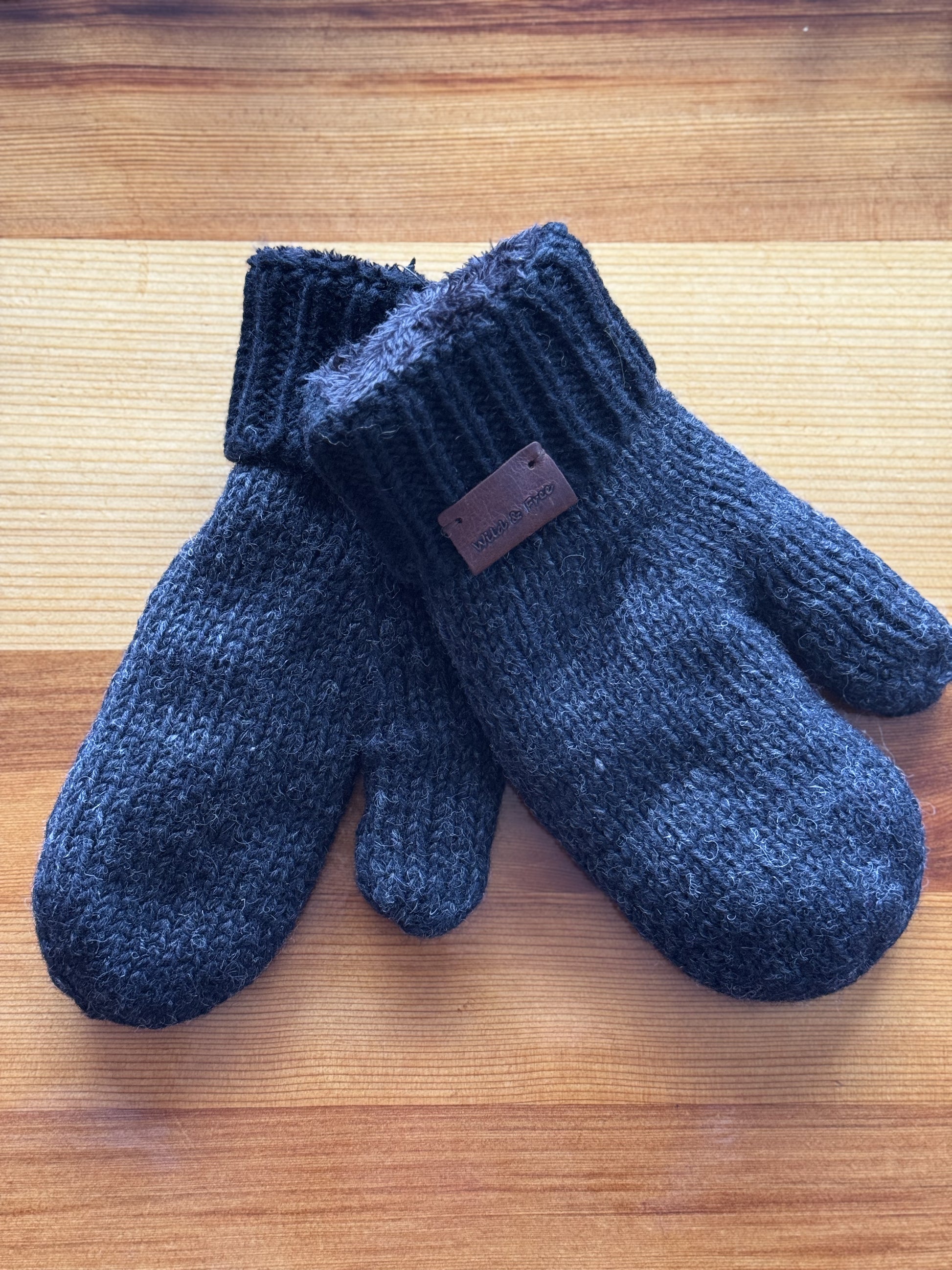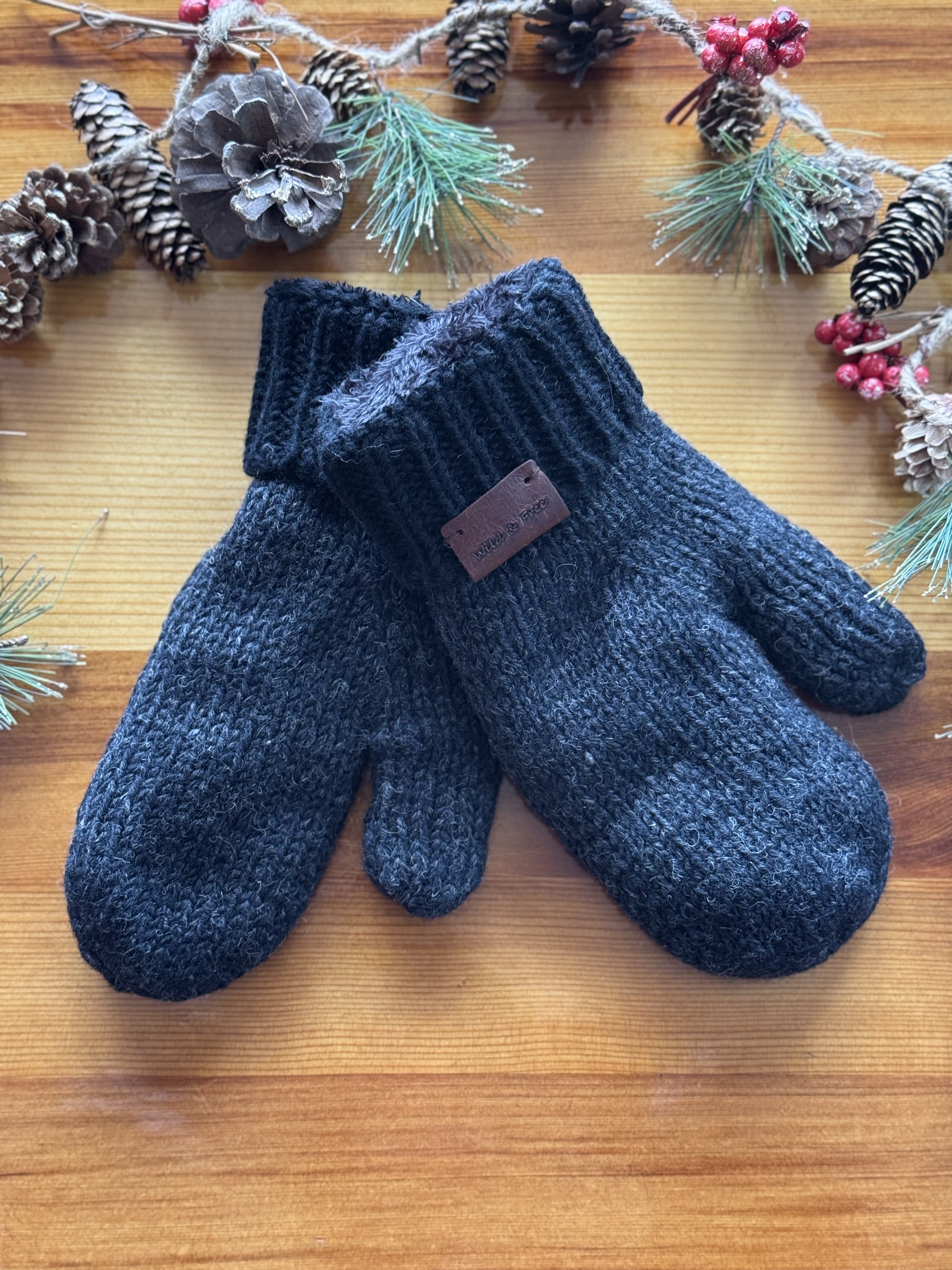 Discover winter's allure with Wild & Free Brand's 100% New Zealand Wool Mittens in a sophisticated charcoal gray. Enhanced by a sleek black cuff, these mittens seamlessly blend style with warmth. The super-soft lining ensures a luxurious feel, offering unparalleled comfort on chilly days. Elevate your cold-weather ensemble with the perfect combination of fashion and coziness.