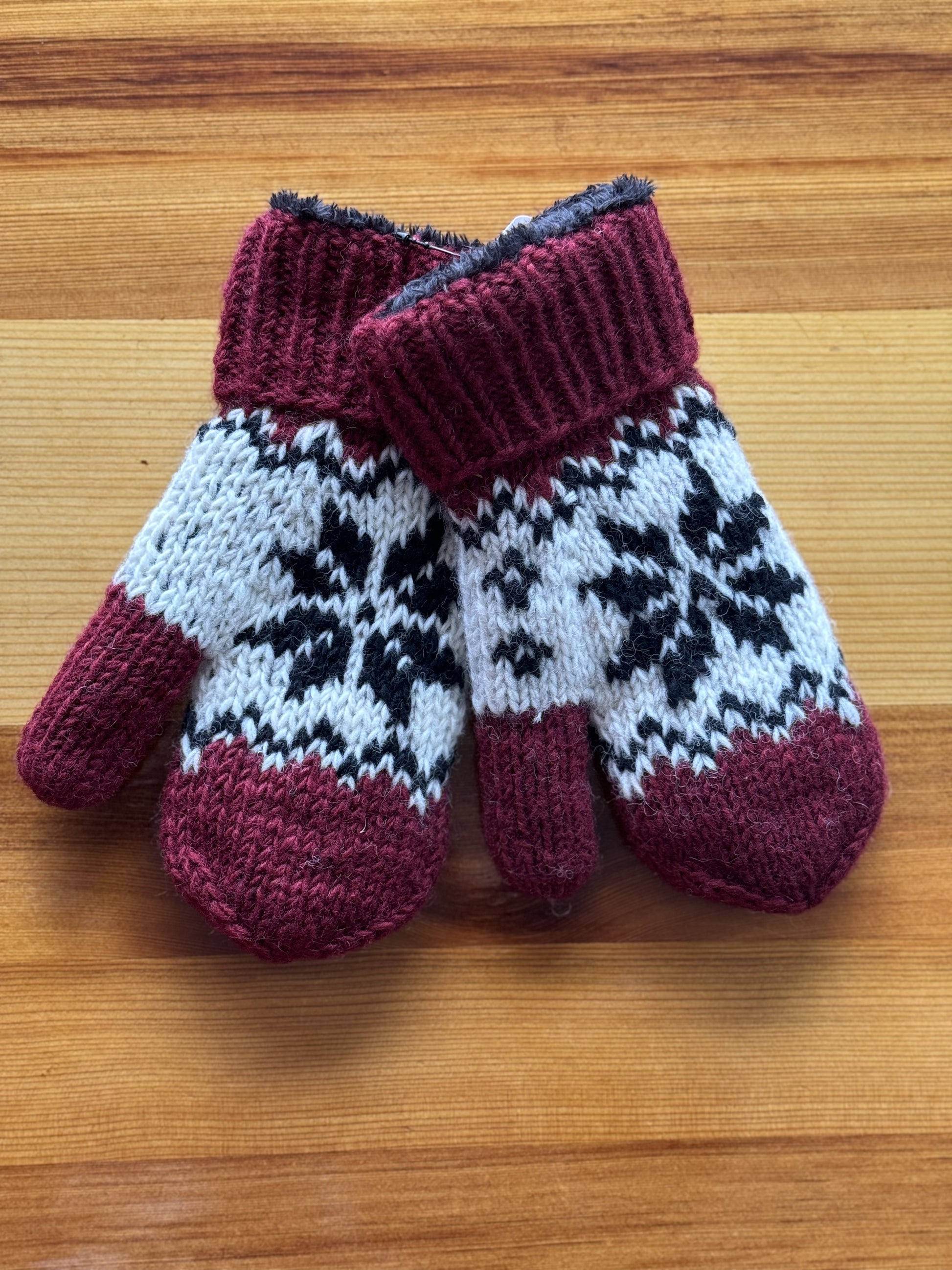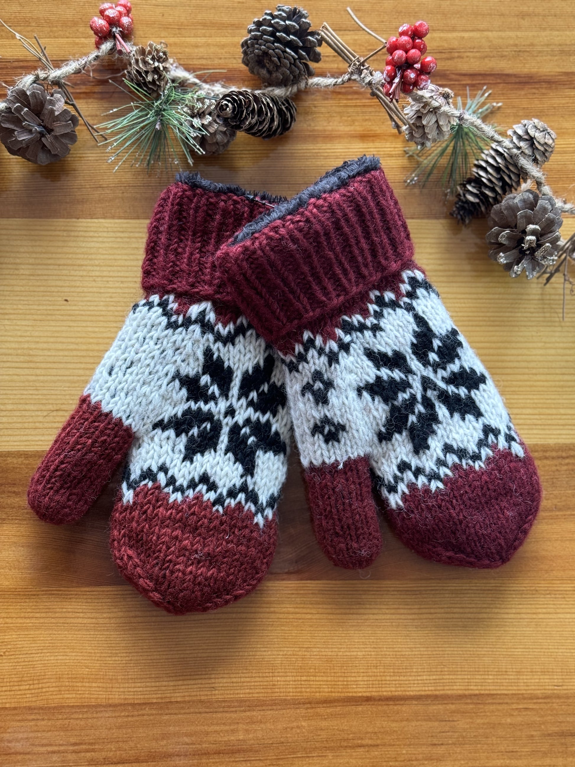 A blend of style and warmth. Made from 100% New Zealand wool, these mittens feature a festive snowflake pattern. The high-quality sherpa lining ensures maximum comfort and insulation for your hands during winter adventures. Perfect for strolls in a winter wonderland or hitting the slopes, these mittens combine durability with a touch of luxury. Embrace the season with our cozy and stylish Red Snowflake Design Mittens